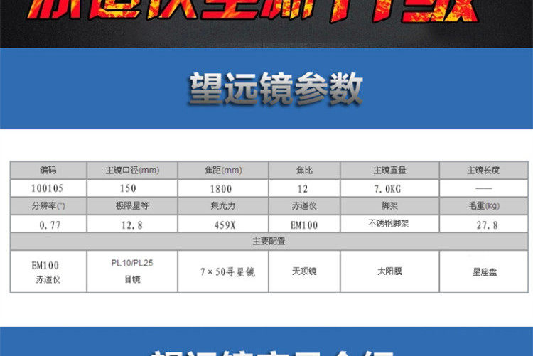 | 分辨率 ('') | 极限星等 | 集光力 | 赤道仪 | 脚架 | 毛重(kg) |