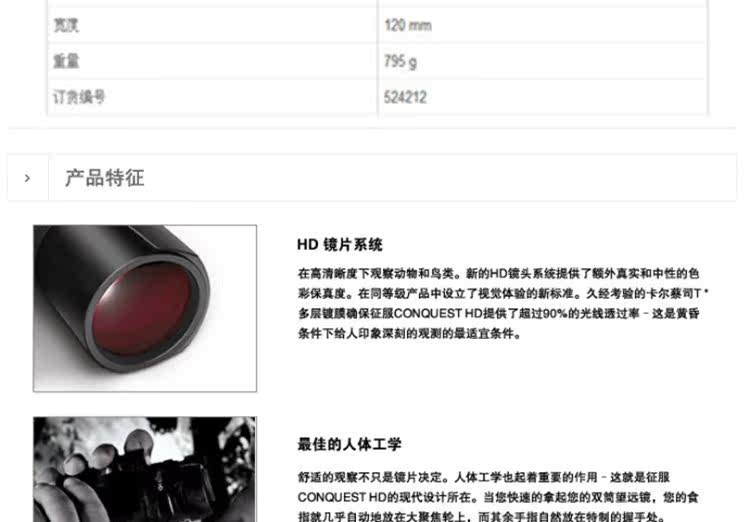 原装进口德国蔡司ZEISS 征服者10x42 HD 高清专业望远镜524212