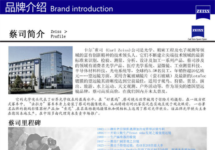 自从1846,公司创始人卡尔.蔡司先生于德国耶拿创建第一间精密机械和光学仪器车间开始,经过近160年的不断开拓、探索、创新、发展,卡尔.蔡司不仅是世界光学制造界领导者,其光学产品更享有世界级盛誉,成为消费者信赖的品牌。