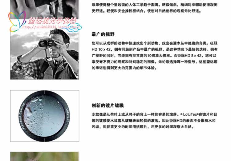 征服HD 10x42提供115米的最大视野。近距离最大的观览,远距离最佳的放大倍率。无论您是观察几百米外灌木丛中的鸟类还是在非洲平原上的斑马,征服HD 10x42是您在任何情况下的完美装备。感谢他增加的放大性能,您能享受自然世界特别详尽的景象。新的设计,结合最佳的人体工学和防滑大调焦轮使得您在任何情况都能高精度的聚焦,确保了观测舒适,不差毫厘。