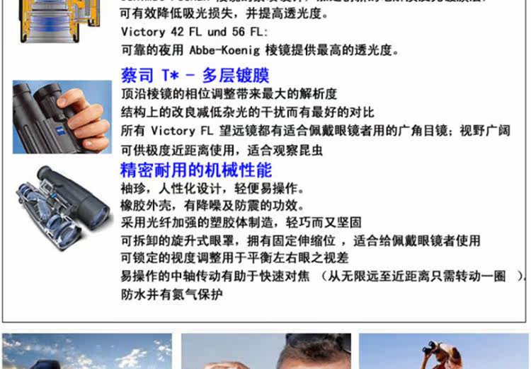 我们的每一台望远镜都有防水,防尘功能。可抗高温,耐严寒,即使在恶劣的环境中使用也可对其信赖。蔡司望远镜有着超长的使用寿命。