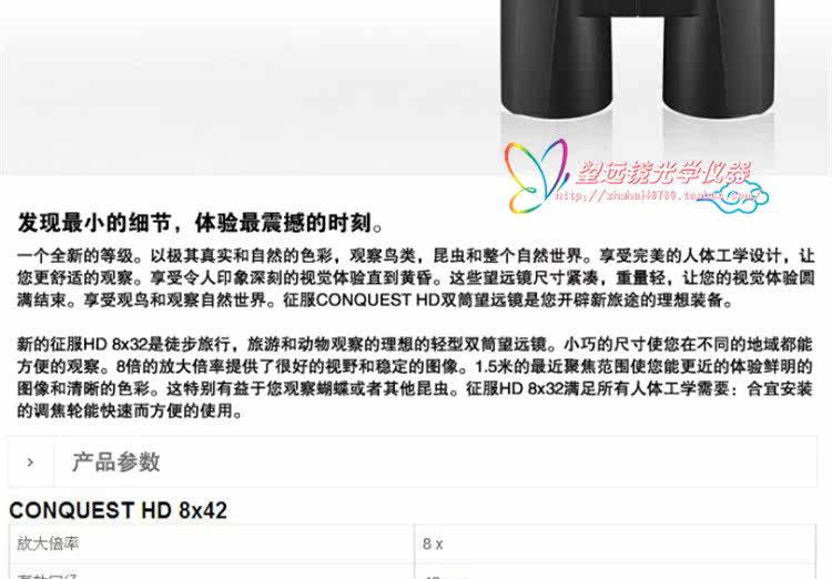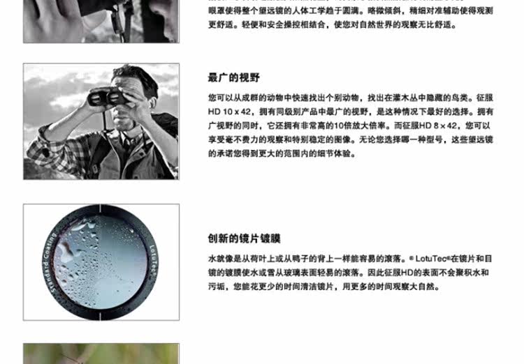 一个全新的等级。以极其真实和自然的色彩,观察鸟类,昆虫和整个自然世界。享受完美的人体工学设计,让您更舒适的观察。享受令人印象深刻的视觉体验直到黄昏。这些望远镜尺寸紧凑,重量轻,让您的视觉体验圆满结束。享受观鸟和观察自然世界。征服CONQUEST HD双筒望远镜是您开辟新旅途的理想装备。