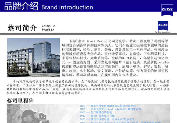 自从1846,公司创始人卡尔.蔡司先生于德国耶拿创建第一间精密机械和光学仪器车间开始,经过近160年的不断开拓、探索、创新、发展,卡尔.蔡司不仅是世界光学制造界领导者,其光学产品更享有世界级盛誉,成为消费者信赖的品牌。