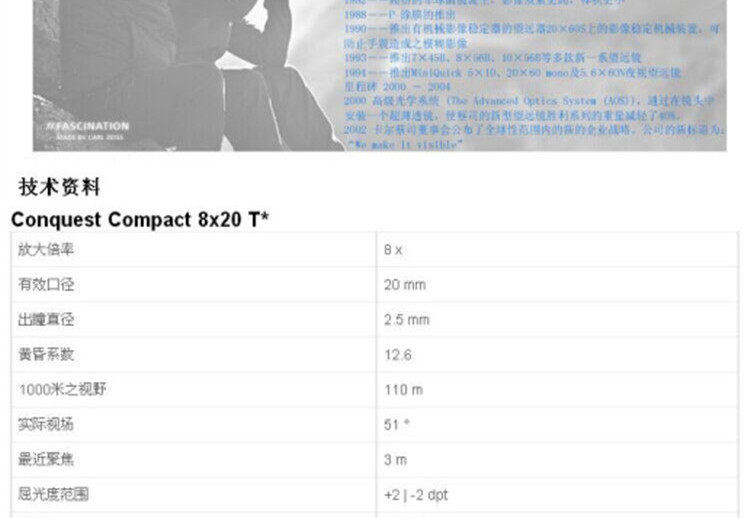 蔡司征服者系列——便携式望远镜身材虽然娇小, 但她出色的技能毫不逊色于蔡司望远镜家族中她的兄长。当你在旅游途中想观看蓝天中的滑翔伞,注视着峭壁的登山家,寻找海上搏击的冲浪者或者您置身于高尔夫球场……拥有这样一台轻便、娇美、视觉效果极佳的蔡司望远镜就可将其尽现您的眼前。