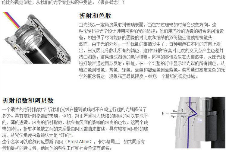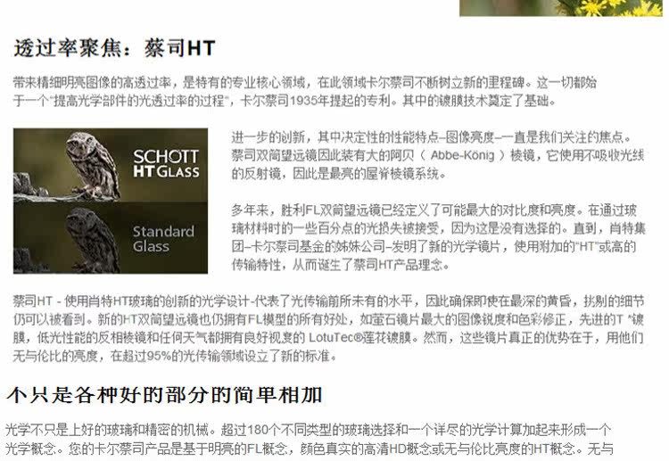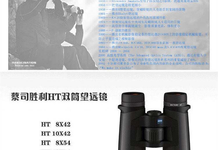 今天卡尔·蔡司正进行下一场光学的新变革,全球独一无二的胜利 VICTORY HT 系列双筒望远镜将是一个全新的顶级双筒望远镜的光学标准。感谢高透过率的肖特 HT 玻璃,卡尔·蔡司的 T* 全表面多层镀膜和阿贝棱镜系统的使用,卡尔·蔡司第一次实现了高于95%的光透过率的光学高品质。因此:胜利VICTORY HT 系列-世界上最亮的顶级双筒望远镜诞生!