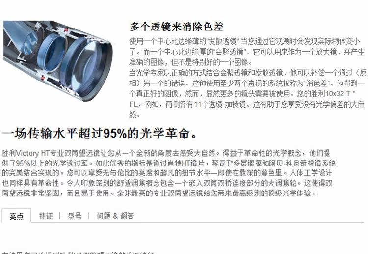 胜利 VICTORY HT 顶级双筒望远镜使您以一个全新的尺度来体验大自然:超过95%的光头率。这个光学标准是革命性的,是来自卡尔·蔡司的光学新发明。肖特的 HT 玻璃,卡尔·蔡司的 T* 全表面多层镀膜和阿贝棱镜系统的使用联合赋予了胜利 VICTORY HT 无可比拟的亮度,对比度,以及显著倍增的观测距离。胜利 VICTORY HT 独一无二的外观,是创新优雅的设计和紧凑结构的完美结合。同时,他人性化的设计同样是一个创新:全新舒适调焦设计,通过使用中轴大调焦轮-双联桥,给人以极其深刻的印象。他使得双筒望远镜极其的结实坚固和方便使用。体验革命性的世界领先的光学——用世界上最亮的顶级双筒望远镜。